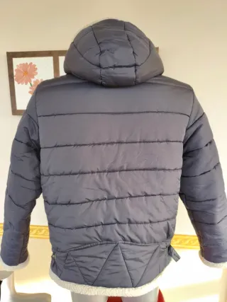 Cazadora de invierno con un diseño moderno y detalles llamativos. - Capucha con pelo sintético negro. - Cierre de cremallera frontal. - Bolsillos laterales con cremallera. - Forro interior. - Puños ajustados., tiene en el cuello unas pequeñas manchas como se ve en la foto, puede ser que al lavarla el revestimiento negro le haya tocado, apenas se aprecia, se puede ver y probar sin problema