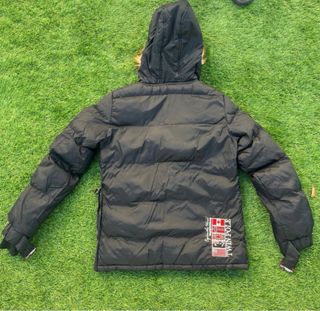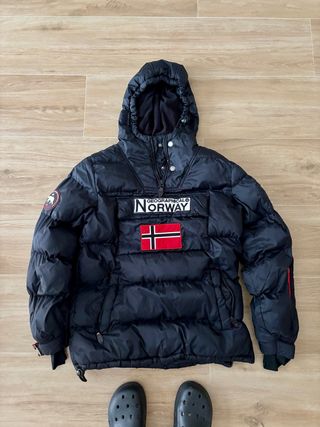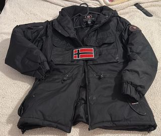 Chaqueta Geographical Norway negra, acolchada y muy abrigada. Diseño con logo frontal y bandera de Noruega, capucha integrada y bolsillos con cremallera. Ideal para invierno y bajas temperaturas. En muy buen estado. Lista para usar.