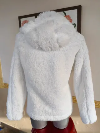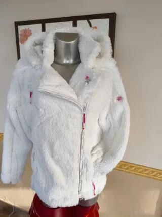 Chaqueta polar blanca con un tacto muy suave. Presenta detalles bordados en color rosa. - Cierre de cremallera. - Capucha. - Bolsillos laterales.