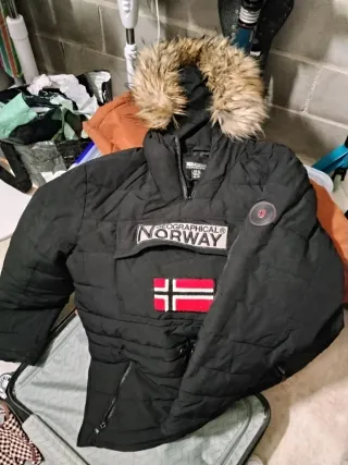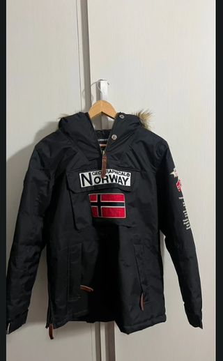 Chaqueta Geographical Norway original negra tipo anorak. Muy abrigada, ideal para invierno. Tiene capucha con pelo, varios bolsillos y parches bordados de la marca. En buen estado. Talla 16Y (equivale aprox a XS / S). Entrega a mano y pago en efectivo.