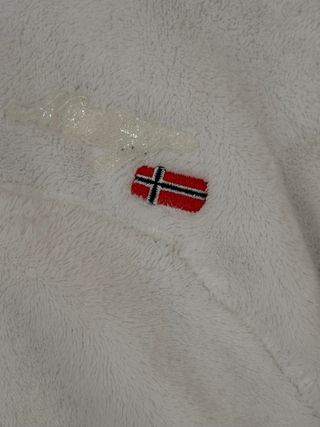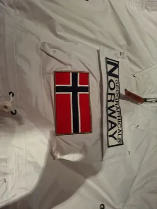 Chaqueta Geographical Norway de color blanco con detalles en azul y la bandera de Noruega. - Diseño con capucha. - Bolsillo frontal tipo canguro. - Cierre de cremallera parcial.