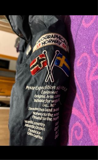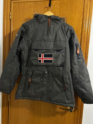 Chaqueta tipo anorak de Geographical Norway. - Diseño con capucha y pelo. - Bolsillo frontal con cremallera. - Cordón ajustable en la cintura. - Parches y bordados temáticos de expedición. - Bandera de Noruega y Suecia.