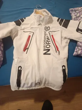 Chaqueta de la marca Geographical Norway en color blanco con detalles en rojo. - Cierre de cremallera frontal. - Bolsillos con cremallera. - Capucha integrada. - Logo de la marca en el pecho y manga.