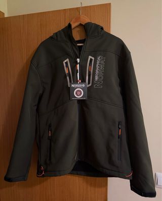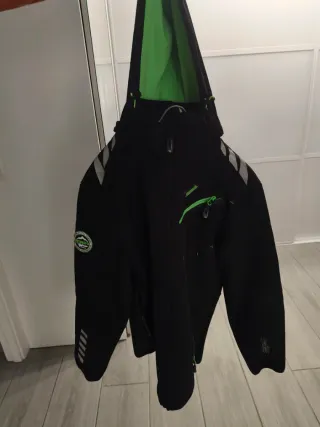 Chaqueta de la marca Norway para hombre, con un diseño moderno y funcional. Utilizada 1 vez. - Color principal negro con detalles en verde. - Capucha integrada. - Cremalleras y detalles de diseño en contraste. - Parche circular con diseño en la manga izquierda. - Bandas reflectantes en las mangas y parte inferior.