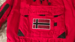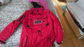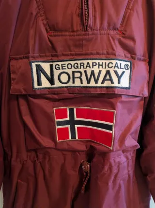 Chaqueta de estilo anorak de la marca Geographical Norway. La talla es 2/M y calculo que será más o menos 36. - Color rojo vibrante. - Diseño con capucha y detalles en negro. - Bolsillo frontal tipo canguro. - Bandera de Noruega en el pecho. Tiene pequeño agujero junto a un bolsillo y el pelo de la capucha está feo. Pero se puede desmontar