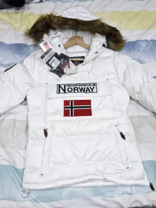 Chaqueta de Geographical Norway en color blanco. Diseño moderno y cálido. - Capucha con pelo. - Bolsillo frontal grande. - Bandera de Noruega en el pecho.