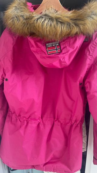 Chaqueta de Geographical Norway en color rosa, ideal para actividades al aire libre. - Diseño con capucha y pelo. - Bolsillo frontal tipo canguro. - Cierre de cremallera. - Detalle de parches y banderas.