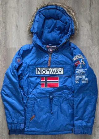 Chaqueta tipo anorak de Geographical Norway en color azul. - Diseño con capucha y pelo sintético. - Bolsillo frontal grande con parche de la bandera de Noruega. - Detalles de parches y texto en las mangas. - Cierre de cremallera parcial en el cuello.