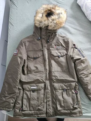 Cazadora Anorak Geographical Norway Parka de invierno original, ideal para frío intenso. Talla L hombre Prenda de segunda mano en muy buen estado, poco usada, sin roturas ni desperfectos. Fabricada con material exterior resistente, cortavientos y preparada para climas fríos. Interior acolchado de gran grosor que aporta mucho abrigo. Capucha amplia con ribete de pelo sintético (faux fur), desmontable o fija según preferencia. Diseño icónico de la marca con parches bordados, bandera de Noruega en el frontal y detalles premium en cremalleras y ajustes. Estilo outdoor / urbano, muy versátil para uso diario