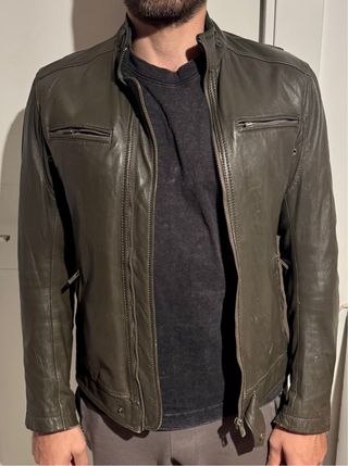 Chupa de cuero premium tipo biker, fabricada en piel natural gruesa y de alta calidad. Superficie mate, sin lacar, con textura ligeramente granulada. Color oliva. Forro interior desmontable, se quita desde la parte inferior, ideal para usarla en distintas temporadas. Talla M. Las medidas exactas se añadirán más adelante. Estado impecable, como nueva, sin signos de uso. No tiene marca visible, pero la calidad del cuero, las cremalleras metálicas y la confección son de nivel alto. Perfecta como leather jacket para uso diario o como biker jacket clásica. cazadora de cuero, Lottusse, Schott, Avirex, Aviador, Chevignon, Timberland
