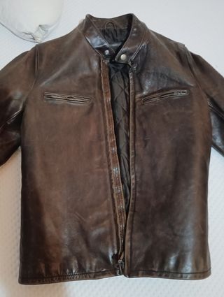 Chaqueta bomber de cuero con acabado vintage y de tacto muy suave. Está en perfectas condiciones. Tiene dos bolsillos internos y siete bolsillos externos. Las cremalleras funcionan a la perfección. Se adjuntan las medidas para que su compra sea más cómoda y segura
