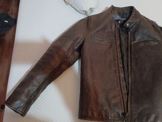 Chaqueta de cuero de la marca Mango. Me la compre hace un par de años por 300 euros, me quedaba un poco grande, pero pensé que crecería mas y no he cambiado así que solo me la he puesto un par de veces, y se ha quedado guardada desde entonces. - Diseño clásico. - Cierre frontal. - Bolsillos con cremallera.