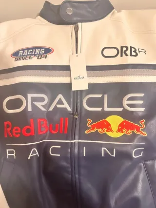 Chaqueta de cuero estilo racing con diseño llamativo. - Combinación de colores azul marino y blanco. - Detalles de estrellas rojas en las mangas. - Logo de Oracle Red Bull Racing. - Cierre de cremallera frontal. - Cuello estilo bomber.