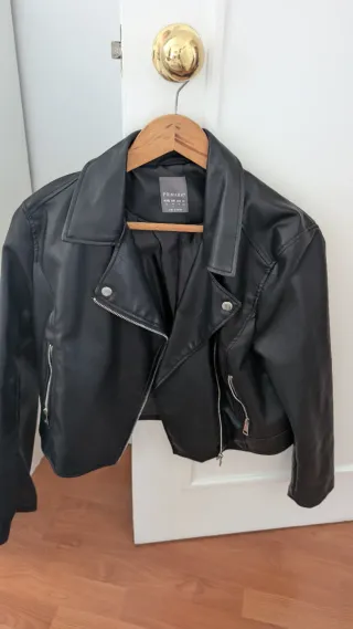 Como nueva, en perfectas condiciones. Es imitación cuero. Solo tiene un pequeño defecto en la parte de atrás (véanse las fotos). Medidas: -Largo: 48 cm -Hombro: 39 cm -Pecho: 98 cm -Cintura: 84 cm En la etiqueta pone que es una L, pero viene pequeña
