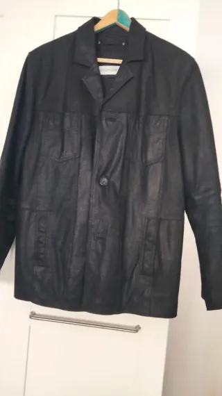 Chaqueta de cuero Easy Wear de El Corte Inglés, talla 52, de hombre. Es de piel ovina natural. Tiene unos 20 años, desgaste propio del uso y con una marca en el lado izquierdo de una pegatina que dejó señal (ver foto). Por lo demás, el botón del bolsillo interior algo descosido y algún roce menor. El tirador de la cremallera se lo cambié hace unos años. Es una talla 52, habitualmente uso una M y me queda bien, complexión delgada y altura media.