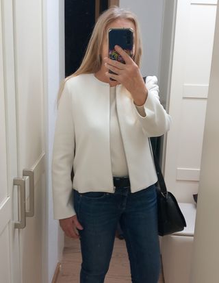 La Chaqueta Corta Virgule Claudie Pierlot blanca elastica es ideal para marcar cintura y alargar la figura, con cuero en el borde del cuello, su sello distintivo y cremallera central metálica qué refuerza esa estética moderna y estructurada. Corte recto ligeramente entallada y hombros marcados, una prenda imprescindible para un estilo chic y refinado. Versátil, con pantalones de sastre de tiro alto y una camiseta. Con jeans de tiro alto. T.40, para mi es un poco grande. Puesta unas horas, impecable sólo qué no la guarde bien y en un lado del cuello hay algunas marquitas insignificante, pongo fotos. Precio Original 380 euros.