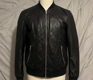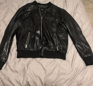 Chaqueta estilo bomber de cuero. - Cierre frontal con cremallera. - Bolsillos laterales con cremallera. - Puños y cintura elásticos. Condition: Very good (leather is well-cared for, zippers fully functional, no visible damage).