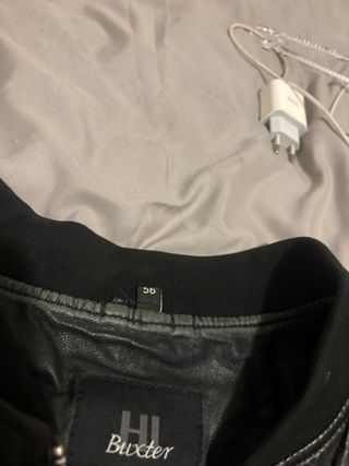 Chaqueta tipo chupa de cuero, sintético, hecho con poliéster. Talla L, va bien para personas con la talla M como es mi caso. Está en buen estado, pero en los bordes de las mangas y del cuello se está pelando. Precio original: 60€