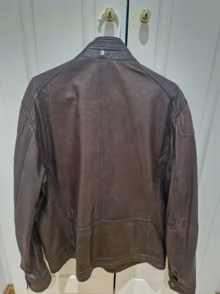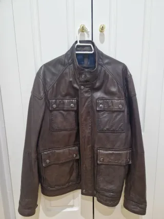Elegante cazadora de cuero con un diseño clásico y versátil. Perfecta para añadir un toque de estilo a cualquier atuendo. Tipo biker o Harrington - Cuatro bolsillos frontales con solapa y botón. - Cierre central de botones. - Cuello tipo harrington Sin usar. Se puede ver y probar sin compromiso