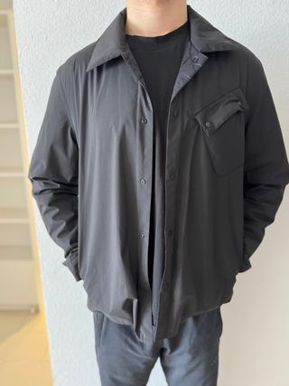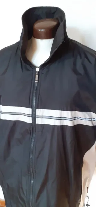 Chaqueta impermeable para hombre con un diseño moderno y funcional. - Combinación de colores negro y gris. - Cierre de cremallera frontal. - Cuello alto. - Banda horizontal con detalles reflectantes. ‐ De hombro a hombro mide 60cm. De pecho mide 64cm. De largo mide 74cm. Está en perfecto estado. ‐ Hago envíos.