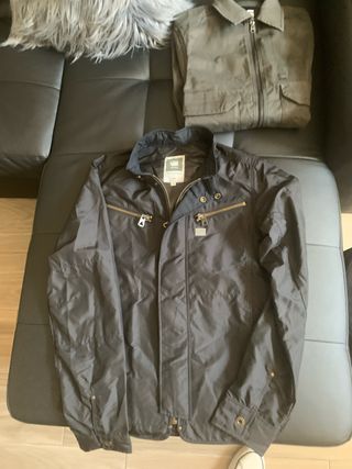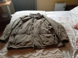 Chaqueta ligera de tela encerada impermeable, tipo Barbour. Talla L - Dos bolsillos con cremallera en el pecho. - Dos bolsillos inferiores para manos - Bolsillo interior amplio - Cierre con clip metálico en cuello Tiene muy poco uso porque me queda grande.