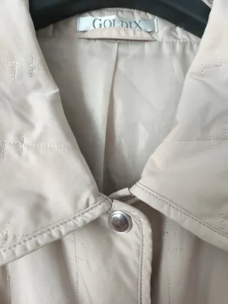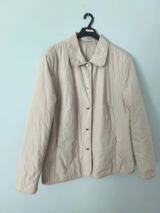 Chaqueta acolchada impermeable de color beige, con un diseño elegante y atemporal. - Cierre de botones clip plateados - Bolsillos laterales con cremallera oculta. - Cuello camisero. Talla 48. Medidas: hombros 48cm, largo 77cm. Bolsillos con interior descosido como se aprecia en las fotos, de ahí su precio. Puesto no se ve. Más en mi armario. Sólo envíos. #básico #beige #chaqueta #acolchado #impermeable