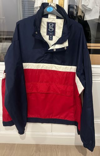 Chaqueta impermeable hombre de la marca Gear for Sports. Talla XL Tiene una pequeña manchita de boli en la espalda pero solo se ha usado un par de veces - Diseño tricolor en azul marino, blanco y rojo. - Cierre de cremallera parcial con botones a presión. - Bolsillo tipo canguro en la parte delantera.