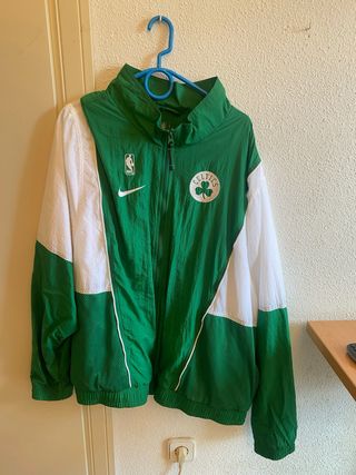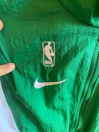 Chaqueta impermeable con el logo de los Boston Celtics. Comprada en mi estancia viviendo allí como estudiante. - Diseño en color verde y blanco. - Logo de Nike. - Logo de la NBA. A mi me va ancha pero es del estilo que se llevan y no tan suelta como se puede pensar!