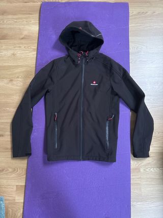 Chaqueta impermeable de la marca Forclaz, ideal para actividades al aire libre. - Diseño con capucha. - Cierre de cremallera frontal. - Dos bolsillos con velcro. - Cordones ajustables en la capucha. Tiene unos años pero no se ha usado apenas, con el tiempo ha perdido algo de impermeabilidad, pero recientemente lo he probado en pequeñas lloviznas y no me he mojado nada. Puede interesar reimpermeabilizarlo si se le va a dar un uso intenso.