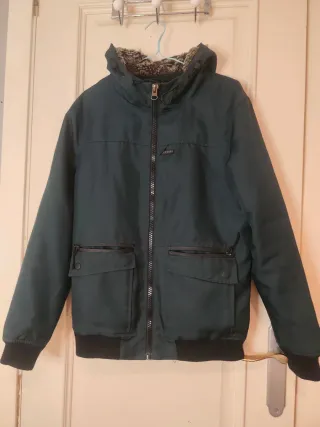 Chaqueta impermeable verde azulada con capucha y el interior de borreguito