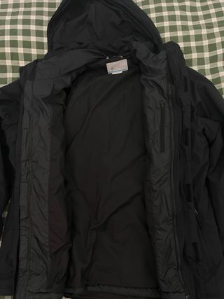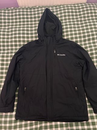 Chaqueta técnica Columbia original en color negro. Es un sistema "Interchange" 3 en 1: incluye una capa exterior impermeable y un forro interior acolchado. Puedes usarlas juntas para frío extremo o por separado según el clima. Tecnología Omni-Tech™: Impermeable y transpirable con costuras selladas. Aislamiento: Forro interior sintético de alta calidez. Detalles: Capucha ajustable, bolsillos laterales con cremallera y bolsillo en el pecho.