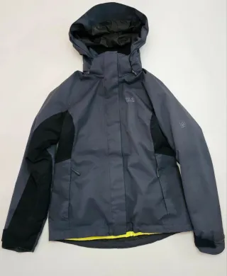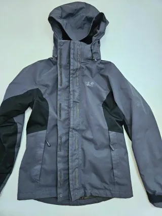 Chaqueta impermeable de la marca Jack Wolfskin, ideal para actividades al aire libre. - Diseño en color gris con detalles en negro. - Capucha integrada. - Cierre frontal con cremallera. - Bolsillos laterales con cremallera.