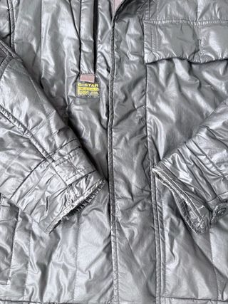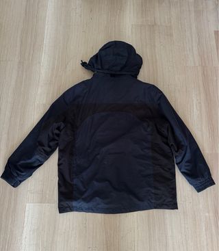 Chaqueta de hombre con capucha y acabado impermeable. - Diseño moderno y funcional. - Cierre frontal con cremallera. - Bolsillos frontales con solapa. - Puños ajustables. Es una chaqueta con uso. Los puños algo desgastados, pero en lineas generales está bien conservada y con mucho uso mas por delante. Es ligera y abrigada. Una chaqueta todoterreno.
