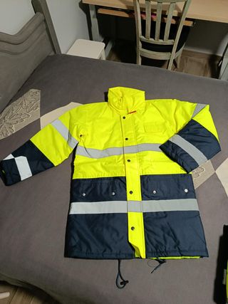 Chaqueta alta visibilidad con detalles reflectantes, ideal para trabajos o actividades al aire libre. SIN ESTRENAR. EN ESTE ANUNCIO ES T/ M y TENGO OTRO ANUNCIO EN MI PERFIL CON UNA T/S Cremallera, botones, bolsillos exteriores e interiores, acolchado interior, capucha oculta en cuello CHAQUETON 3/4 , CHAQUETA , ABRIGO , IMPERMEABLE ........ - Buena calidad - Color principal amarillo fluorescente. - Paneles inferiores y mangas en azul marino. - Cintas reflectantes plateadas. - Cierre frontal cremallera y botones. - Cuello alto. - La foto d la etiq.con las medidas no es muy real, yo mido 182 y me está bien d larga