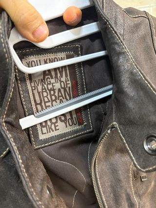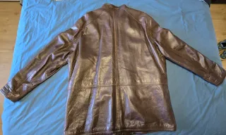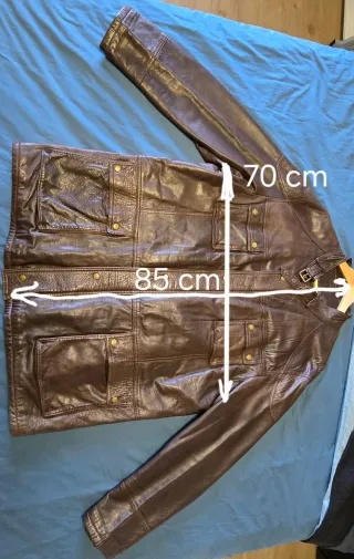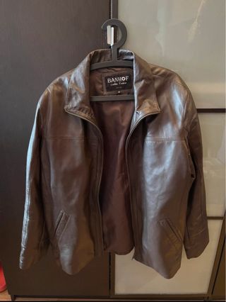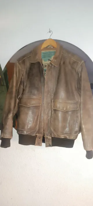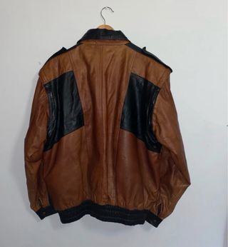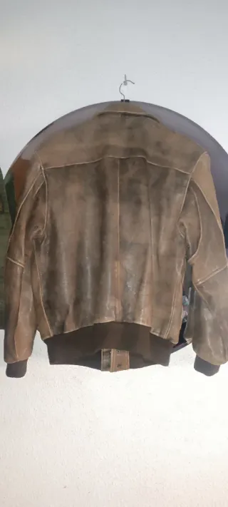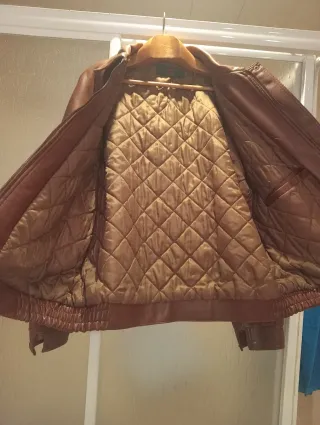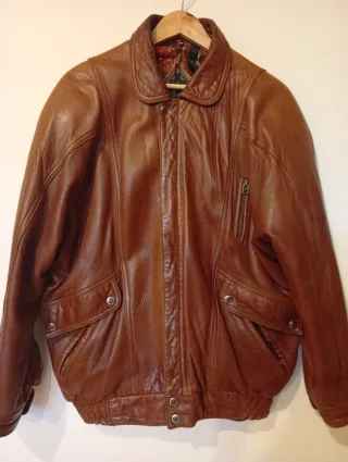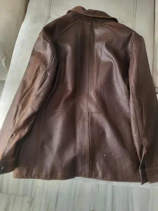Chaqueta de cuero con un diseño clásico y elegante, con un desgaste leve por el uso. - Material: Piel auténtica. - Color: Marrón. - Cierre de botones y cremallera. - Bolsillos frontales.