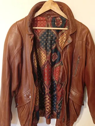 Chaqueta de piel de estilo vintage en color marrón con un forro interior estampado, talla 54. - Diseño clásico. - Cierre de cremallera. -Cinco bolsillos frontales más uno interior. -Mide de ancho de hombros 62 centímetros,de ancho de axilas 70 y de largo 70 centímetros.