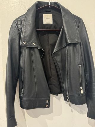 Chaqueta de piel estilo motero de Mango. - Diseño con cuello solapa. - Cierre de cremallera frontal. - Bolsillos con cremallera. - Detalle acolchado en hombros.