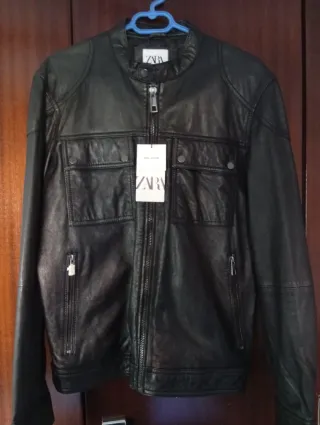 Chaqueta de piel para hombre de Zara. Diseño moderno y elegante Talla L - Cuello mao con botón. - Cierre de cremallera. - Bolsillo superior con cremallera. - Dos bolsillos inferiores con cremallera. - Detalle acolchado en hombros. Como nueva muy poco uso