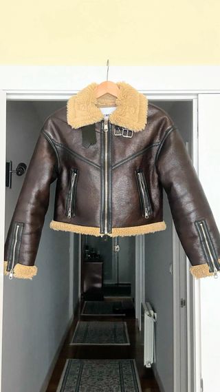 📌Cazadora marrón de efecto piel con forro de borreguito de Bershka. 📌 Impecable. 📌 Talla XS (48 cms de hombros, 50 cms entre axilas y 47 cms de largo).