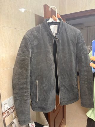 Cazadora de cuero de Stradivarius, 100% piel (ver etiqueta 100% goat leather) en color gris envejecido. Talla M. Medidas: unos 37 cm de hombro, 47cm de pecho o sisa y64 cm de largo total. Se abrocha con cremallera y cinturón también de piel. En buen estado en general, con las típicas vetas del uso de la piel y alguna pequeña mancha que en el conjunto de la prenda no destacan. Tiene 4 bolsillos delanteros con cierre de cremallera y un bolsillo interior en la parte derecha sin cremallera.