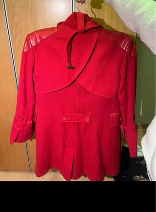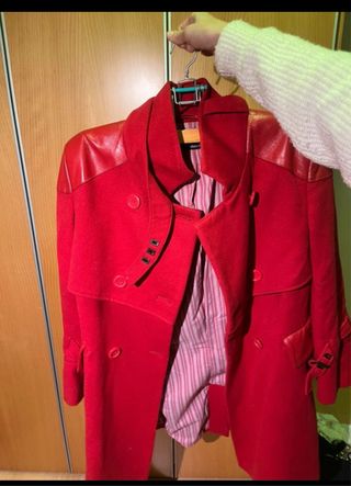 Elegante chaqueta roja con un diseño moderno. - Detalles en piel en los hombros y bolsillos. - Cierre cruzado con botones. - Forro interior a rayas.