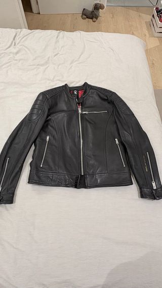 Chaqueta de piel auténtica con un diseño moderno y detalles cuidados. - Cuello redondo con cierre de botón. - Cremallera frontal. - Bolsillos con cremallera en el pecho y laterales. - Detalle en los hombros. Esta chaqueta está hecha para durar. Cuanto más se use, más carácter adquiere. Las costuras en hombros, combinadas con costuras precisas, proporcionan una estructura sólida y una apariencia distintiva. El forro interior suave y confortable garantiza un ajuste cómodo, mientras que las cremalleras metálicas resistentes y los detalles inspirados en motocicletas completan el look masculino y auténtico. NUEVA a estrenar