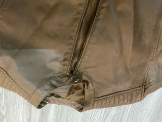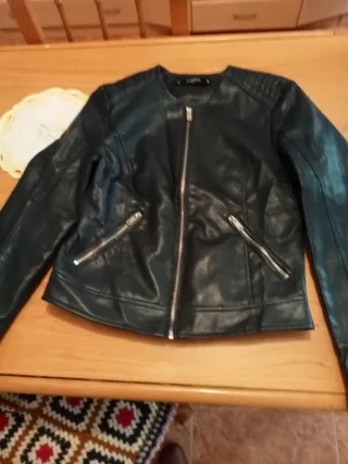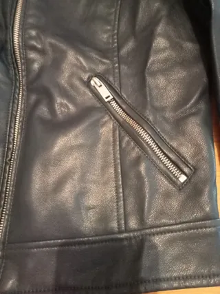 Chaqueta de estilo motero con efecto piel. No tiene ningún defecto y bien cuidada. - Cierre de cremallera frontal. - Bolsillos con cremallera. - Cuello redondo con cierre de botón. - Detalle de pespuntes en hombros y mangas.