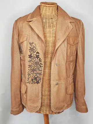 Chaqueta de piel auténtica color beige, de una de las marcas de la prestigiosa peletería Torras. Es una chaqueta nueva, de cuero ultra suave con textura de pequeños agujeritos y con aplicaciones de bordados. Una prenda única y de diseño muy original. Perfecta para entretiempo y verano. Tiene una pequeñísima raya de bolígrafo en la solapa ( ver foto ) y uno de los cierres con el hilo un poco suelto. Medidas (en cms): Hombros: 42 Largo: 57 Pecho: 98 Largo de manga: 64 - Material: Piel auténtica. - Color: Beige. - Diseño perforado. - Detalle bordado floral