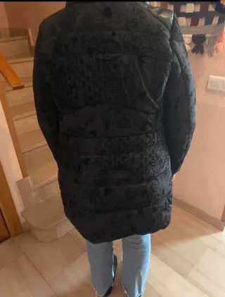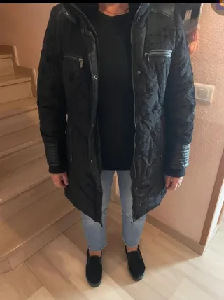 Chaqueta KARÖSHI talla XL aunque ponga XXL és tallaje pequeño muy elegante y cálida . Diversos bolsillos. Cremalleras laterales y bolsillos. Doble cierre de cremallera y cierres. Negra con dibujos florales en relieve que resalta a la vista. Usado en un par de ocasiones me va pequeña. Detalles de piel en los puños y hombros.