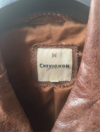 Chaqueta de cuero de la marca Chevignon en color marrón. Talla: M (es entallada) Piel de cabra Largo: 71 cm Pecho: 45 cm Hombro: 41 cm Largo mangas: 63 cm Tiene un pequeño descosido en la sisa y le falta un botón
