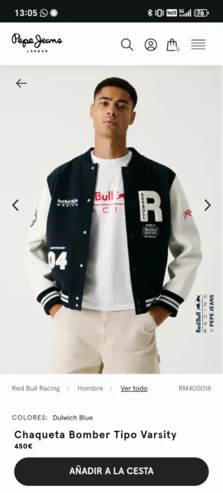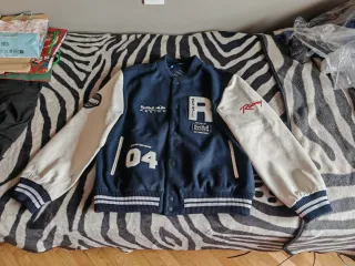 Chaqueta estilo varsity de la colaboración entre Pepe Jeans y Red Bull Racing. Diseño moderno y deportivo. - Mangas de color blanco(piel) y cuerpo azul marino. - Logo de Red Bull Racing bordado en el pecho. - Detalle de número '04' en la parte frontal. - Inscripción 'Racing' en una manga. - Puños y cintura con rayas.
