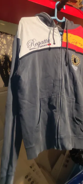 Sudadera chaqueta con capucha y cremallera completa, con un diseño bicolor y detalles gráficos. Usada. Nota última foto. Pero en buen estado general. Pedido min 3€ - Diseño frontal con Regatta Royal Docks. - Detalle de escudo con Sailing Field de Toro en el lado derecho. - Capucha con cordones. Logo bandera de España. - Bolsillo canguro delantero. Más artículos escribiendo algeral en búsqueda general. Se hacen lotes en conjunto con los otros perfiles.