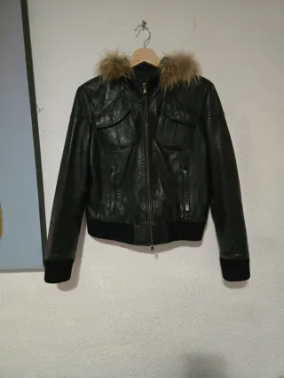 Chaqueta de piel auténtica con detalles de pelo en la capucha. - Diseño tipo bomber. - Cierre de cremallera frontal. - Dos bolsillos con solapa en el pecho. - Puños y cintura elásticos.