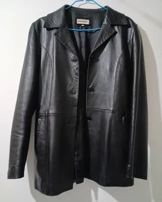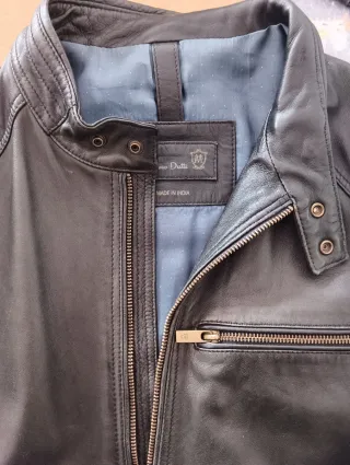 Chaqueta de cuero genuino con un diseño clásico. - Material: Piel auténtica. - Color: Negro oscuro. - Detalles: Tachuelas metálicas en cuello, hombros y mangas. - Bolsillos: Dos bolsillos frontales con cremallera y un bolsillo superior con botón. - Cierre: Cremallera frontal.